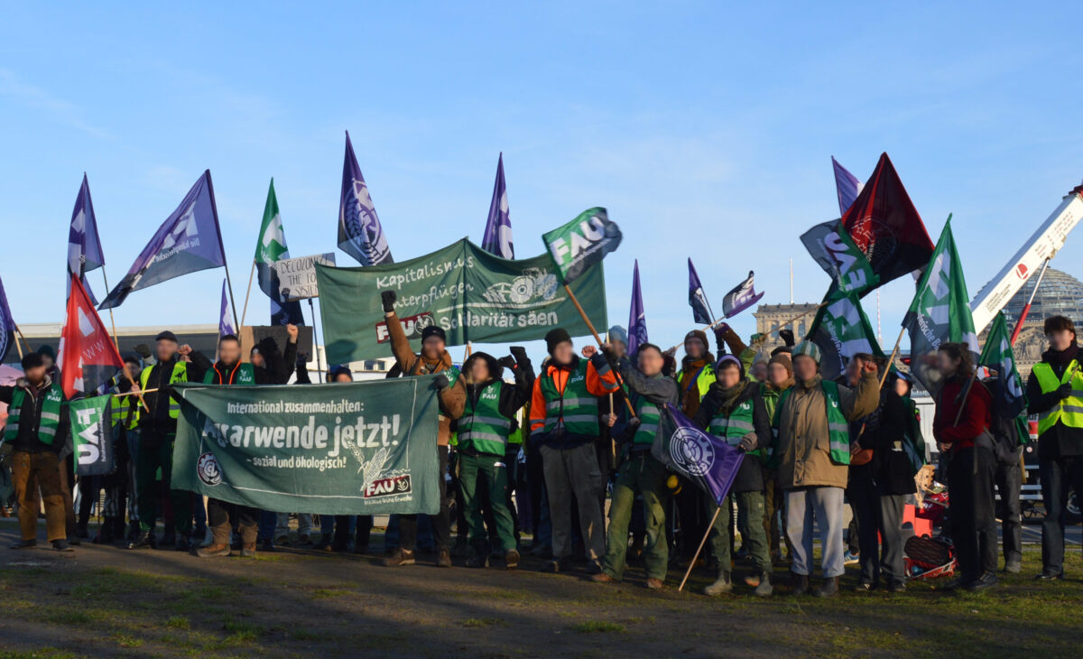 Wir arbeiten uns wenig am DBV ab – klar ist aber, dass der Verband nur der großen Agrarindustrie und ihren Profiten dient und kein progressiver Akteur ist und zwar in allen Punkten: Der DBV ist einer der Hauptakteure, wenn es um die Monopolisierung der Branche, Erhöhung des Ausbeutungsgrades und den Kampf gegen jedwede Umweltstandards geht. Die Branche wäre ohne den DBV wesentlich besser dran als mit ihm. In diesem Jahr haben wir uns auch offen gegen den DBV gewendet, weil dieser forderte, dass der Mindestlohn für ausländische Arbeitskräfte ausgesetzt oder gemindert werden sollte. Das ist natürlich nicht nur ein rassistischer Angriff auf diese Kolleg:innen selbst, sondern auf alle Beschäftigten in der Landwirtschaft, die dann unter Druck gesetzt würden, ihre Arbeitskraft ebenfalls billiger anzubieten und ggf. trotzdem erwerbslos bleiben würden. Also mensch kann schon sagen, der DBV ist unser direkter Gegenspieler. Dagegen arbeiten wir mit dem kleinbäuerlichen Verband «Arbeitsgemeinschaft bäuerliche Landwirtschaft» (AbL) immer wieder punktuell zusammen. Dort organisieren sich vor allem Klein- und Biobetriebe und es ist der linkeste unter den deutschen Bäuer:innenverbänden.