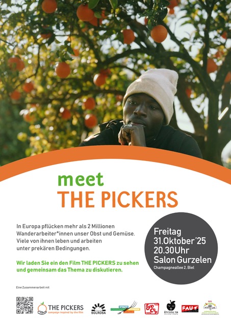 Salon Gurzelen, Champagneallee 2, Biel-Bienne BielMeet the Pickers: In Europa pflücken mehr als 2 Millionen Wanderarbeiter*innen unser Obst und Gemüse. Viele von ihnen leben und arbeiten unter prekären Bedingungen. Rencontrez les cueilleurs : en Europe, plus de 2 millions de travailleurs migrants cueillent nos fruits et légumes. Beaucoup d'entre eux vivent et travaillent dans des conditions précaires. Freitag, 31.10.2025, 20.30,…
